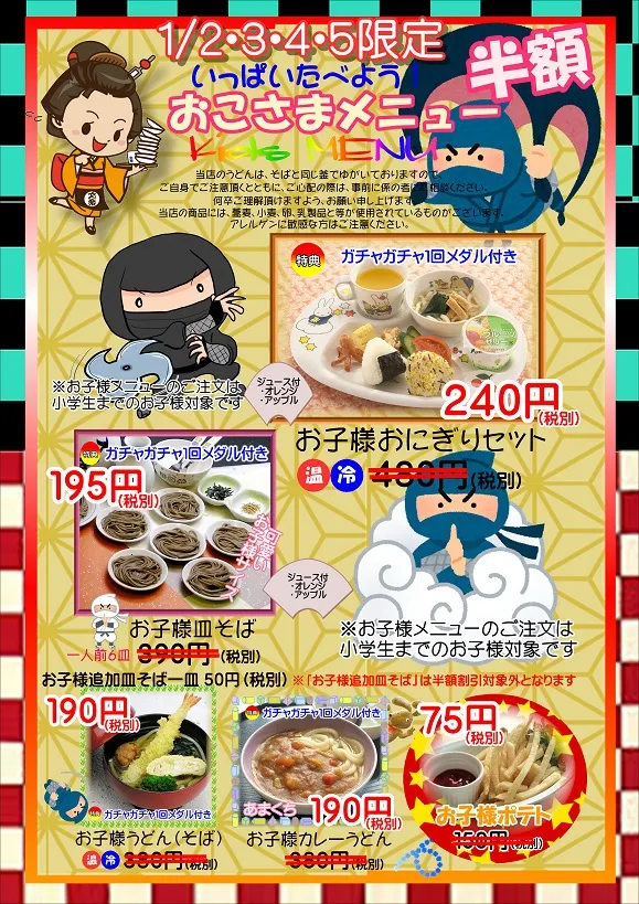 1月2日から1月5日まではお子様メニューが半額となります。