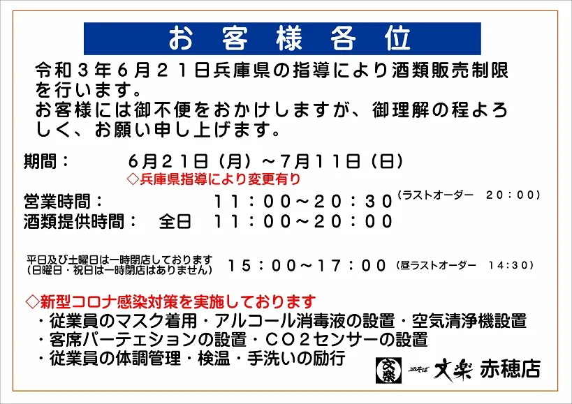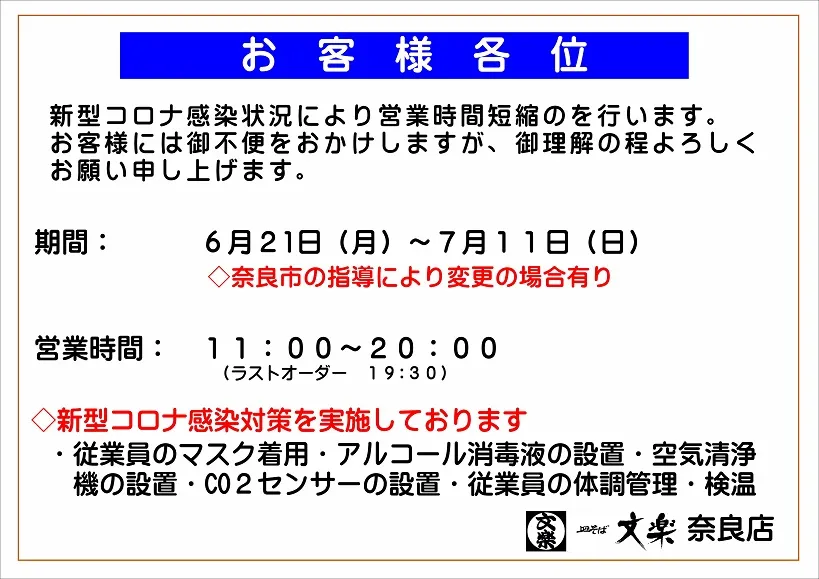 6月21日より各店営業時間のお知らせです。