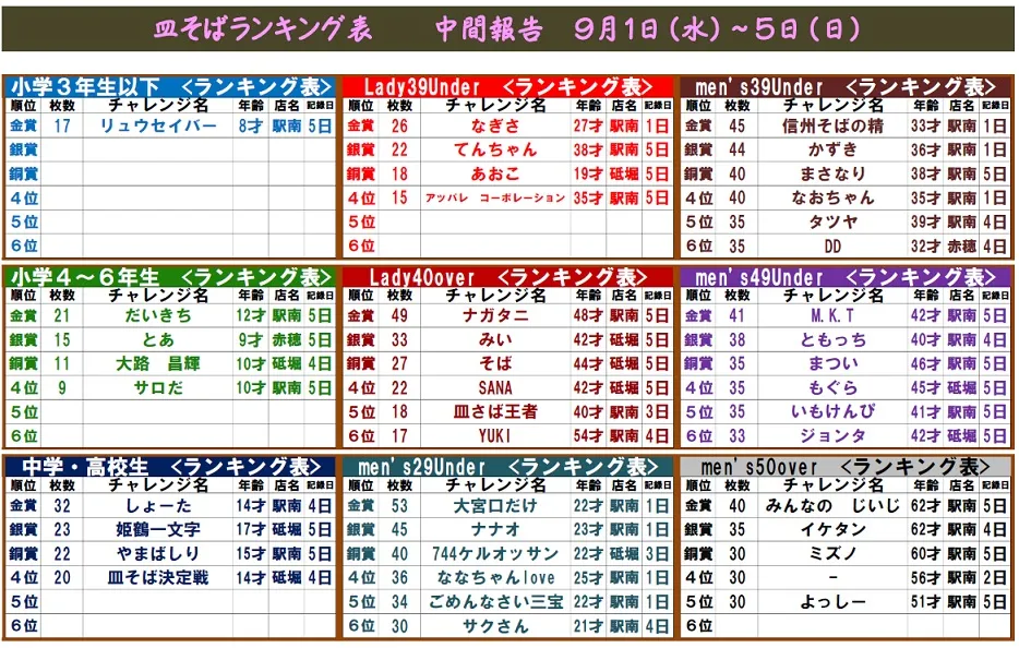 皿そば王者決定戦 中間報告 2021/09/07 いよいよ皿そば王者決定戦が始まりました。日曜日ごとに集計してホームページにて報告していきます。 1日から5日のランキングと写真掲載にご協力いただきました参加者様もご紹介します。 まだまだ、日にちはありますので、是非挑戦お待ちしておりま~す。 メニュー