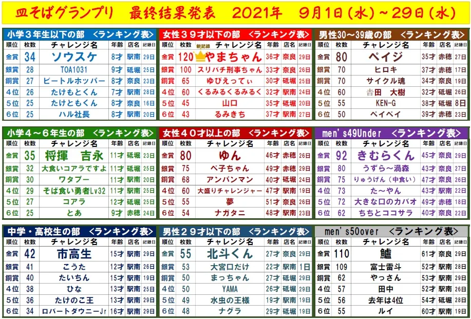 大変お待たせいたしました。 9月1日から9月29日まで大好評にて終了しました、皿そば王者決定戦結果発表です。
