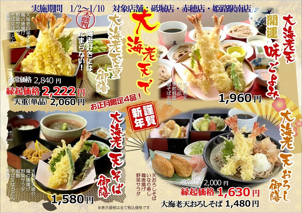 年末年始特別メニューのご案内です。 2021/12/28 年末年始、特別メニューのご案内です。 尚、1月1日元旦は休業日とさせていただきます。 実施期間:冬の天ざる祭り 12/27~1/10 新年大海老天祭り 1/2~1/10 対象店舗:砥堀店・赤穂店・姫路駅南店 ※食材仕入れの状況により早期終了の場合があります。 メニュー