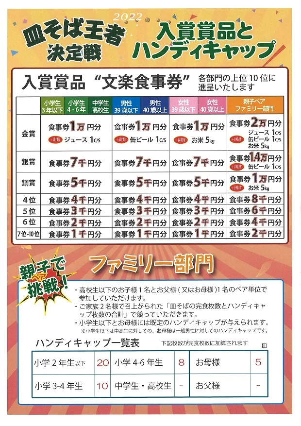 【告知】今年もやります! 皿そば王者決定戦♪ 2022/08/29 告知が遅くなりましたが、今年も9月1日より9月29日まで皿そば王者決定戦を開催します。 年間最大のイベントとなります。 今年は親子ペアでの挑戦していただくファミリー部門が加わりました。 合わせて、秋の感謝祭としていろいろ企画しております。 是非皆様のご来店お待ちしております。 詳しくは↓↓↓ お知らせ