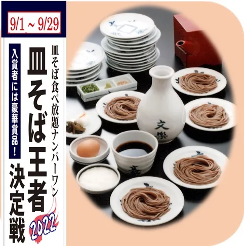 9月厳選食材メニューは、初秋のそば&皿そば王者決定戦☆彡 2022/09/01 9月の厳選食材メニュー、秋の食材を使ったメニューでお待ちしております。 合わせて、皿そば王者決定戦も本日より開催します!! 是非、挑戦してみてください。 一部メニューの紹介です。 メニュー