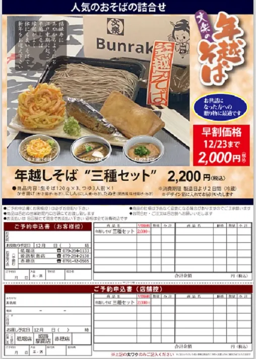 年越しそば予約受付中! 2022/12/14 毎年恒例の年越しそば、予約受付しております。 23日金曜日までのご予約で少しお得な価格となります。 人気の特製天ぷらそばは当日販売が少ないので是非ご予約を!! お知らせ