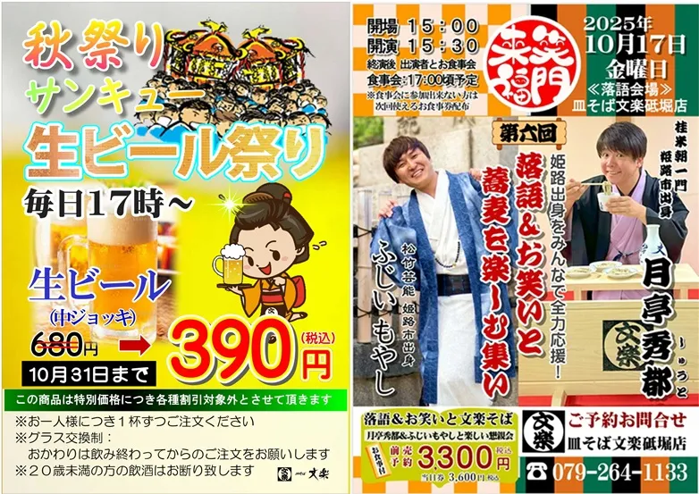 10月のおすすめメニュー(奈良東向通店除く) 2025/10/01 10月からは秋の天ざる祭りです。 少し過ごしやすくなりました。 舞茸やさつま芋など秋の食材の天ざるそばです!! 食欲の秋♪ お得な天ざるをご賞味くださいませ。 そして秋祭り!生ビールもお得になってます。 落語会も開催です! よろしくお願いいたします。 メニュー